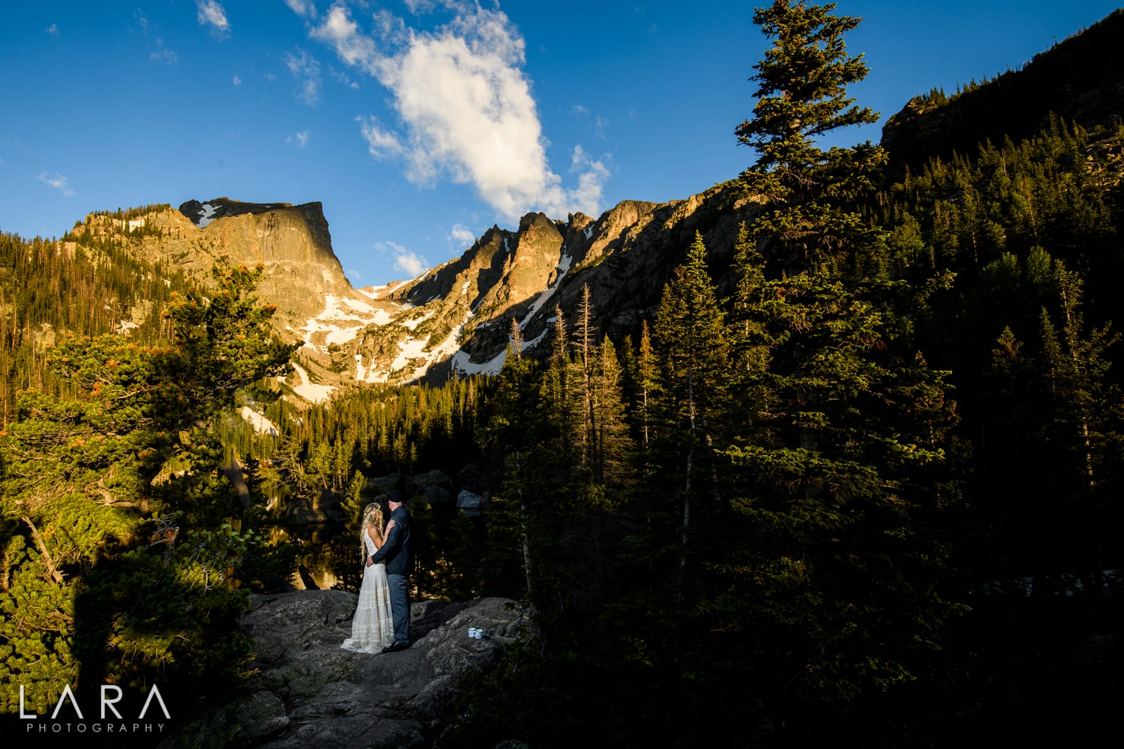 This ceremony site has arguably one of the best scenic views in RMNP. A well-groomed trail surrounds the entire lake making it easily accessible for guests. This location receives a lot of foot traffic and privacy is limited. The parking lot is also fairly small, so be prepared that you may need to be dropped off by a shuttle. As such, we generally only recommend this location on weekdays, during the “off-season”, or for sunrise elopements.
