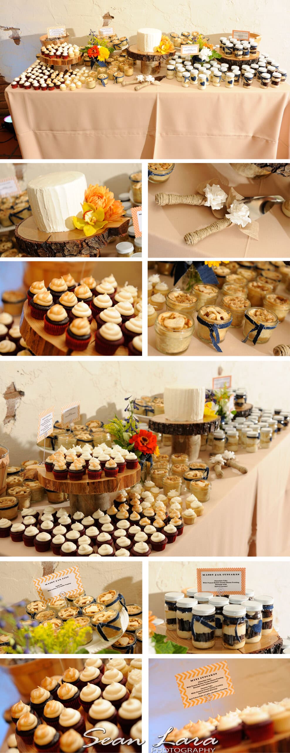 A lot of time and creativity was put into their country themed wedding. Each of the tables had center-pieces with a different drinks as the theme, and the dessert table was full of home-made pies and cakes.