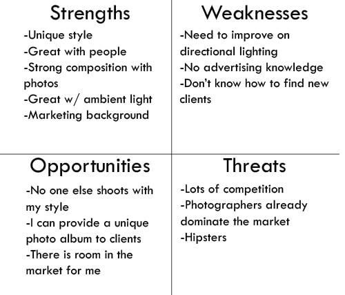 You may now ask, how do I build my portfolio if I don’t have clients? My advice is to try and assist other photographers in the industry and build your portfolio that way, even if it means working for free. My goal was to become a wedding and event photographer, so I started my career as an intern with the Orange Country Register and being the editor of my college newspaper. I put in hours and hours of slave labor and it all paid off because I made connections, learned how to take photos in a professional environment and honed my lighting and composition skills. Because of the credibility I earned shooting for one of the largest newspapers in the country, I was able to get my foot in the door with professional wedding photographers and asked to assist them. After about two years of “training” I was ready to start thinking about a career. 2) Specify Your Target Audience At this point you should already know what category of photography you want to specialize in, however the next important step is to identify your target audience. Let’s say you want to become a portrait photographer. In order to be a successful portrait photographer, you cannot be broad with your photography (at least not early in your career), you need to have a focus. Are you going to be primarily a senior portrait photographer, corporate photographer, sports photographer, etc? Focusing on a specific category will help you dominate a particular market; you want to spend most of your marketing efforts in only a couple categories as opposed to “doing some marketing here and some there”, but we will talk a little more about this in step 5. It will also help to research the market, learn their purchasing habits and how much clients are paying for photography services in the area. 3) Build a Business Plan and Identity It’s important to have a business plan to stick to. Obviously as your business grows and you obtain clients things may change, but it’s always nice to have something to follow and set goals. A business plan will help you stay on track and measure your results. You need to research your industry, identify the market and come up with ideas on how you can create a unique niche for your business to attract customers. How are you going to create an identity for yourself? What is so special about you that will make people book you as opposed to the photographer down the street? These are questions you should be asking yourself sooner than later to help you have an advantage over the competition. To help build a business plan, I recommend creating a SWOT analysis. Take 10 minutes to write down on a piece of paper your Strengths, Weaknesses, Opportunities and Threats. Check out the example to the right: