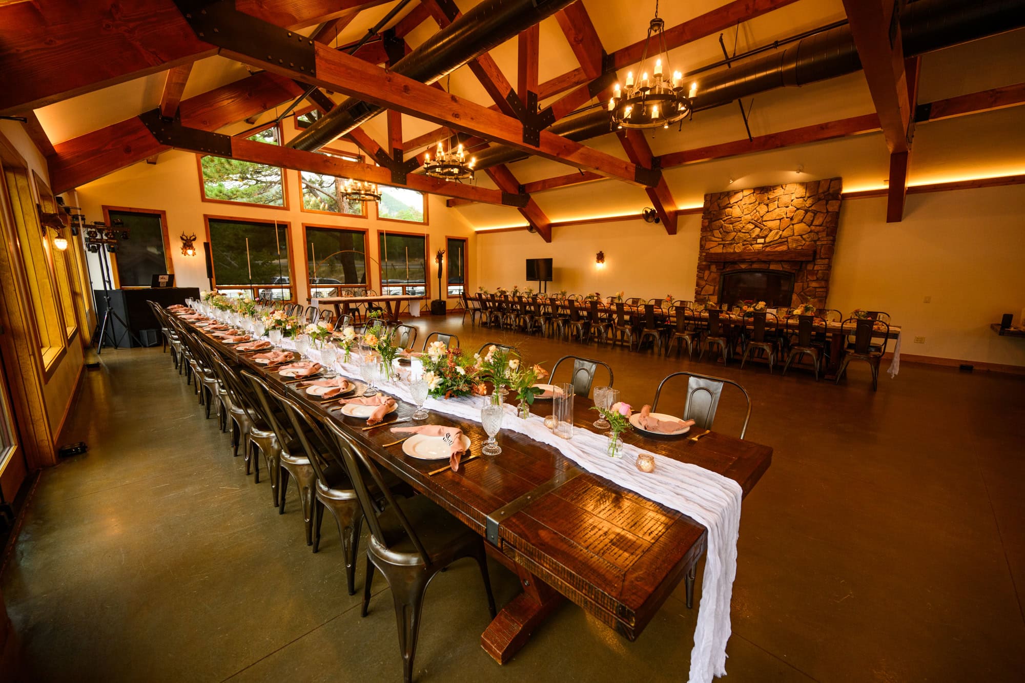 And speaking of indoors, the reception hall is stunning. It blends a modern design with mountain cabin inspiration, making it a really fun and stylish place to host your guests and throw a great party. Step just outside the doors, and you’re immediately surrounded by incredible views of the mountains, the river, and everything that makes Estes Park so special.
